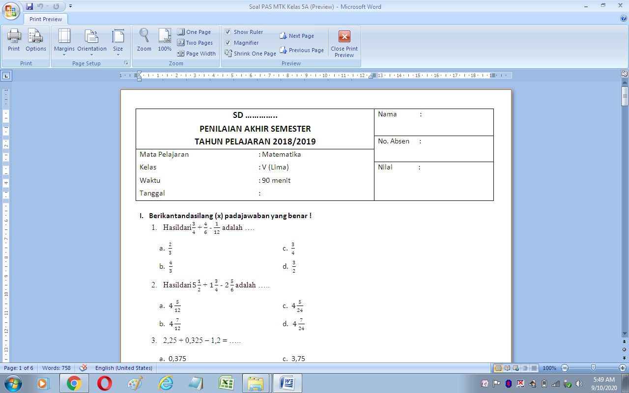 Soal Uas Matematika Kelas 5 Sd Semester 1 Ganjil Dan Kunci Jawaban Www Bimbelbrilian Com Pdf