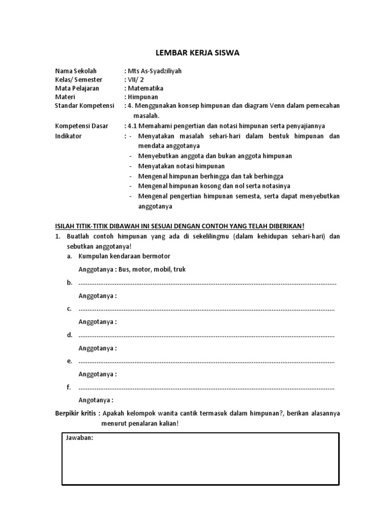 Pdf Rencana Pelaksanaan Pembelajaran Rpp Sekolah Smp Pribadi 1 Tangerang Mata Pelajaran Matematika Kelas Semester Viia I Materi Pokok Himpunan Alokasi Waktu 2 X Jam Pelajaran Kelly Kobak Academia Edu
