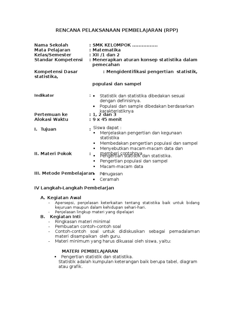 Doc Rencana Pelaksanaan Pembelajaran Satuan Pendidikan Smp Mata Pelajaran Matematika Kelas Semester Ix Genap Materi Pokok Statistika Penyajian Data Dua Variabel Alokasi Waktu 1 Pertemuan 3jp Novan Andriann Academia Edu