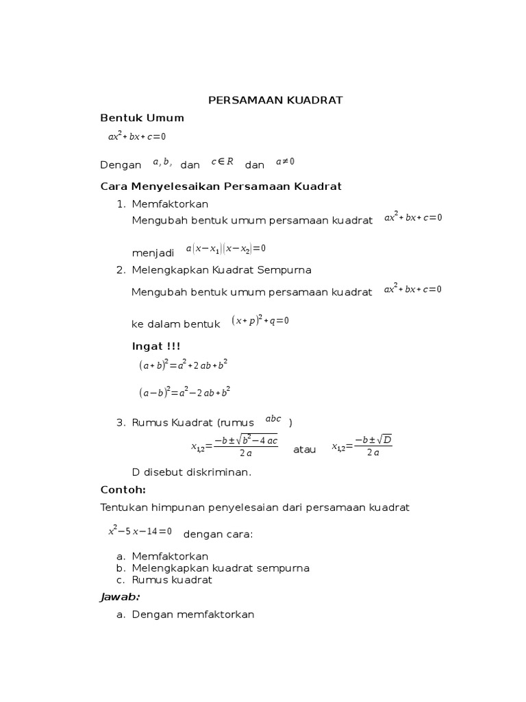 Rumus Dasar Matematika Materi Penyelesaian Persamaan Kuadrat Dengan Kuadrat Sempurna