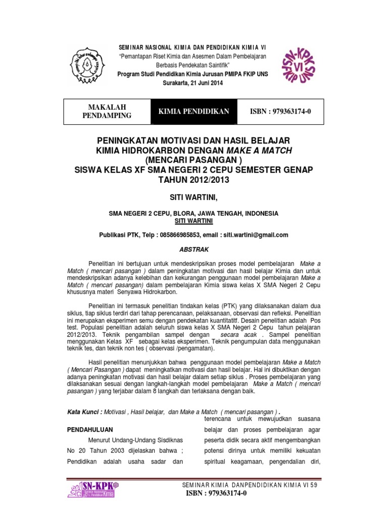 Perbandingan Motivasi Dan Prestasi Belajar Kimia Peserta Didik Kelas X Semester Ii Sman 11 Yogyakarta Tahun Pelajaran 2015 2016 Pada Penerapan Model Pembelajaran Kooperatif Tipe Make A Match Dan Bamboo Dancing Lumbung Pustaka Uny