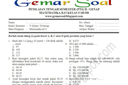 Download Soal Dan Kunci Jawaban Pts Uts Matematika Kelas 5 Semester 2 Sd Mi Kurikulum 2013 Sdn Sobang 2