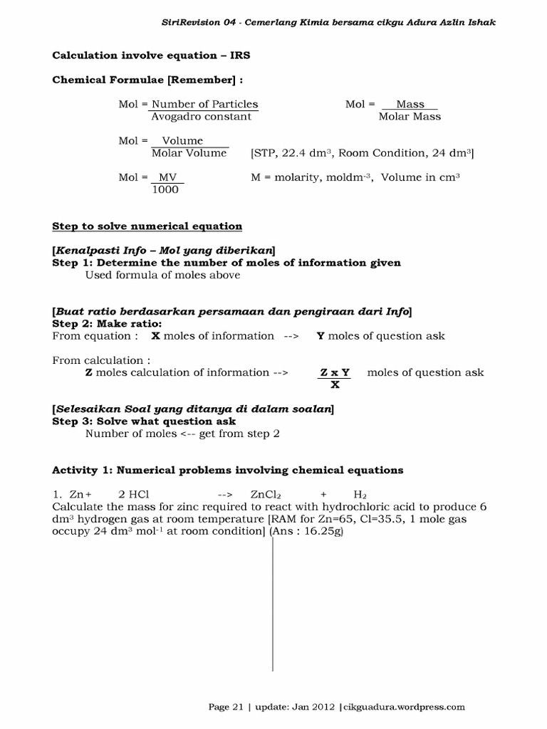 Cikgu Nurul Asas Kimia Menyelesaikan Masalah Penghitungan Berdasarkan Persamaan Kimia