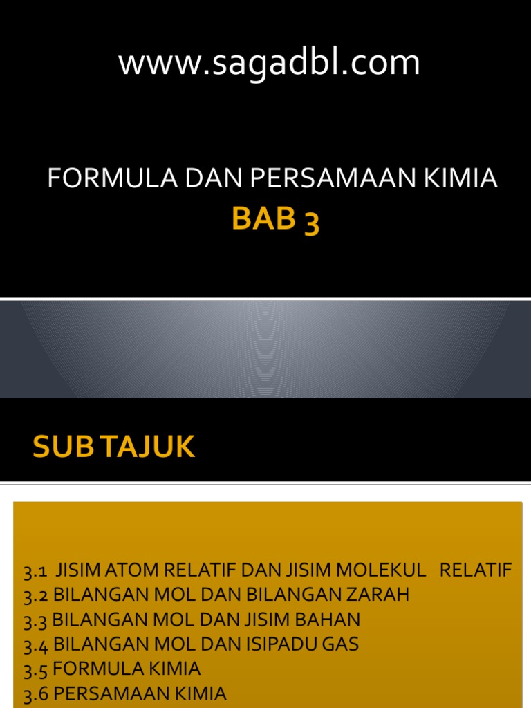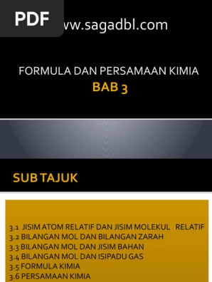 Bab 3 Formula Persamaan Kimia Pptx Www Sagadbl C Om Formula Dan Persamaan Kimia Bab 3 Sub Tajuk 3 1 Jisim Atom Relatif Dan Jisim Molekul Course Hero