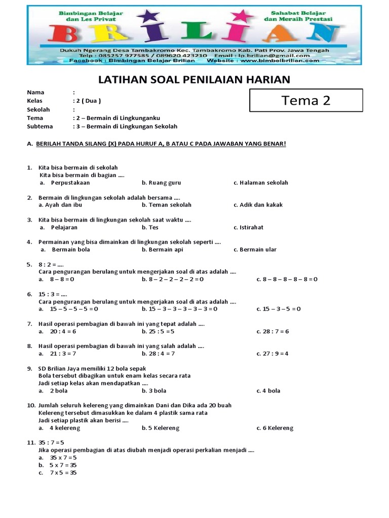 Soal Tematik Kelas 2 Tema 2 Subtema 3 Bermain Di Lingkungan Sekolah Dan Kunci Jawaban Bimbel Brilian