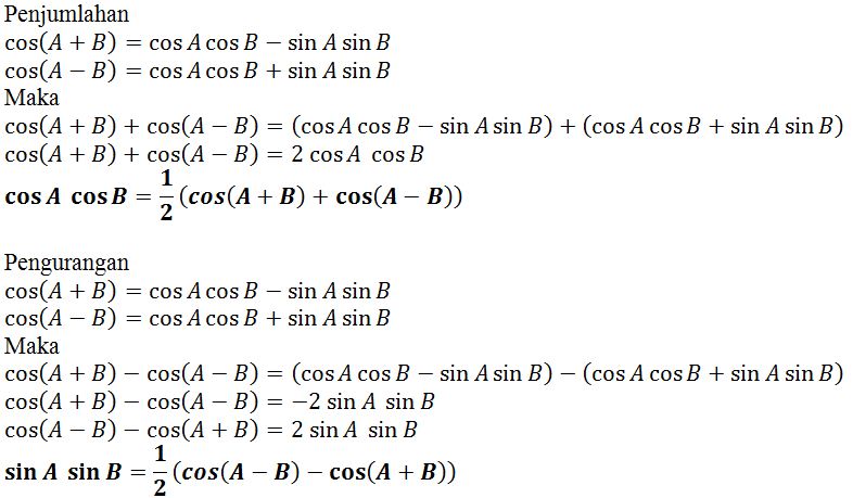 Rumus rumus penjumlahan pengurangan atau perkalian dalam trigonometri dapat diturunkan dari rumus jumlah dua sudut atau selisih dua sudut. Penjumlahan atau pengurangan dalam trigonometri khususnya sinus dan cosinus bisa kita nyatakan dalam bentuk perkalian. Rumus konversi perkalian ke penjumlahan pengurangan.