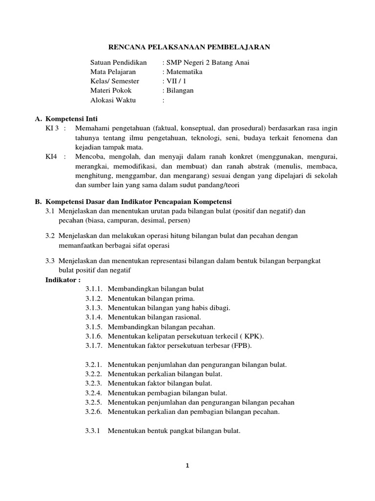 Doc Contoh Rencana Pelaksanaan Pembelajaran Rpp Matematika Kelas Semester Vii 1 Nyai St S Academia Edu