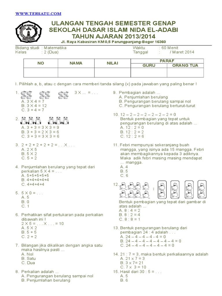 Soal Matematika Kelas 2 Sd Bab 5 Perkalian Dan Pembagian Dan Kunci Jawaban Bimbel Brilian