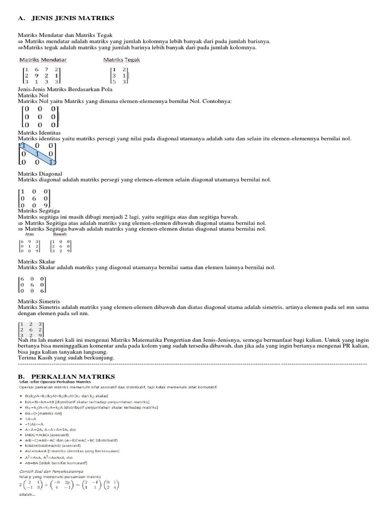 Contoh Soal Matriks Pengertian Jenis Jenis Sifat Operasi Invers Jawaban Notasi Dan Ordo Penjumlahan Pengurangan Perkalian Transpose Skalar Determinan Matematika