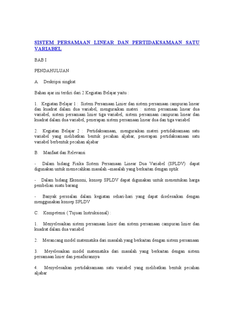 Bab 3 Sistem Persamaan Linear Menyelesaikan Pertidaksamaan Satu Variabel Yang Melibatkan Bentuk Pecahan Siswa Dapat Menentukan Penyelesaian Sistem Persamaan Linear Dua Variabel Pdf Document