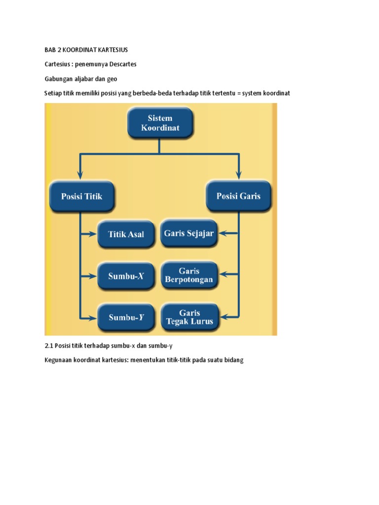 Dalam gabungan sumbu horizontal berlabel x dan sumbu vertikal yang akan diberi label y dengan sistem koordinat tiga dimensi sebagai sumbu yang bersifat ortogonal satu sama lain. Posisi dari titik pada bidang koordinat cartesius ditulis dalam bentuk pasangan bilangan x y di mana. Garis sejajar dengan koordinat.