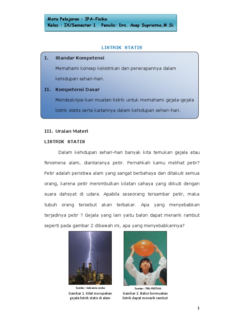 Ringkasan Dan Latihan Soal Un Ipa Smp Mts Materi Listrik Statis