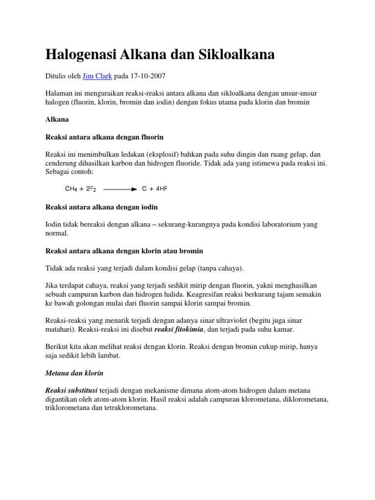 Atom Karbon Primer Sekunder Tersier Filea Halogenasi Pada Alkana Reaksi Suatu Senyawa Dengan Halogen Khlorinasi Brominasi A Halogenasi Pada Alkana Cl Didapat H Pdf Document