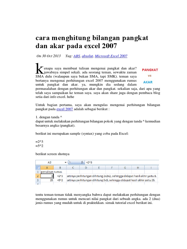 Ilmu Pendidikan Dan Pelatihan Rumus Kuadrat Akar Kuadrat Pangkat Dan Akar Pangkat Pada Ms Excel