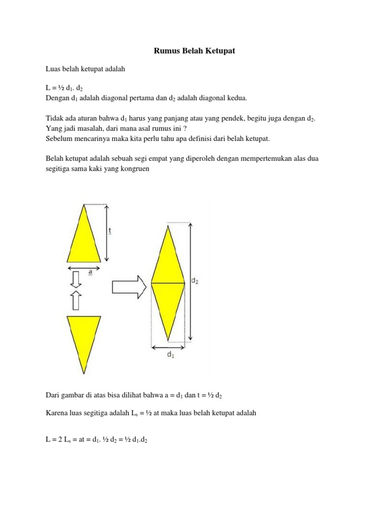 Belah ketupat hay sahabat semuapada perjumpaan kali ini kembali akan quippercoid sampaikan pembahasan materi makalah tentang belah ketupat. Belah ketupat juga dapat dibangun dari dua buah segitiga sama kaki yang identik dan simetri pada alas alasnya. Rumus keliling belah ketupat.