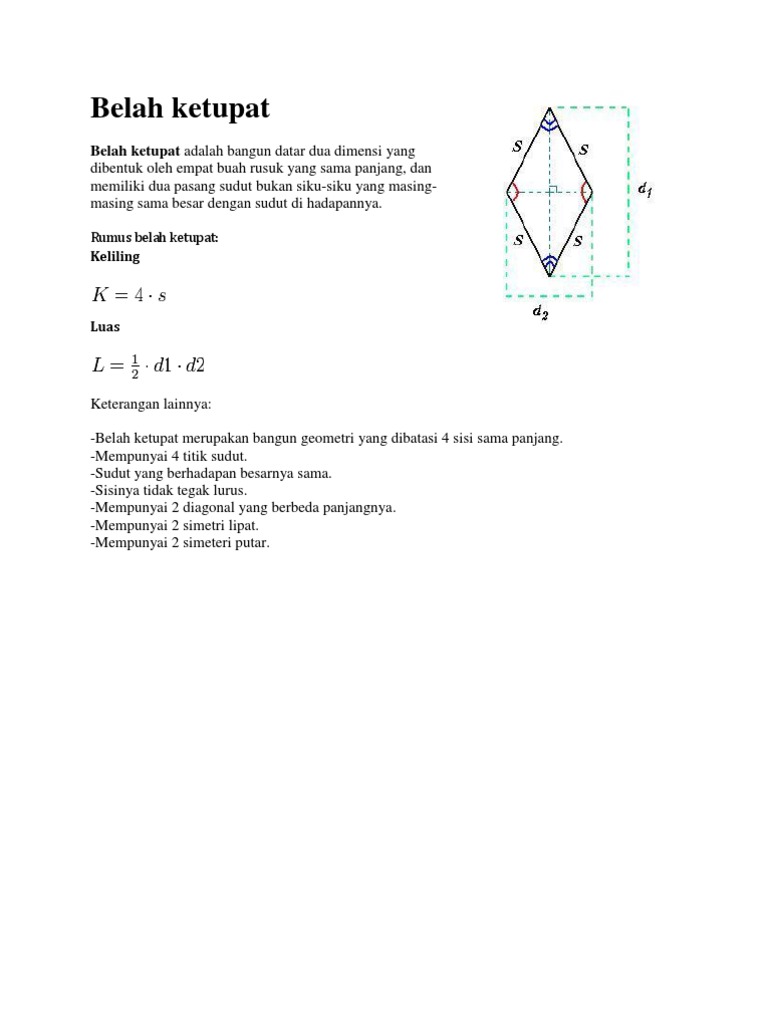 Pengertian belah ketupat belah ketupat adalah bangun datar 2 dimensi yang dibentuk oleh 4 buah sisi yang sama panjang dan mempunyai 2 pasang sudut bukan siku siku dengan sudut yang saling berhadapan mempunyai besar sama. Namun pada perjumpaan sebelumnya yang mana kami juga telah menyampaikan materi tentang bangun datarnah untuk melengkapi apa yang menjadi pembahasan kita kali ini maka mari simak ulasan selengkapnya di bawah ini. Rumus luas dan keliling bangun belah ketupat belah ketupat adalah sebuah bangun datar dua dimensi yang terbentuk oleh 4 buah rusuk yang panjang sama dan mempunyai 2 pasang sudut bukan siku siku yang masing masing besarnya sama dengan sudut yang ada di hadapannya.