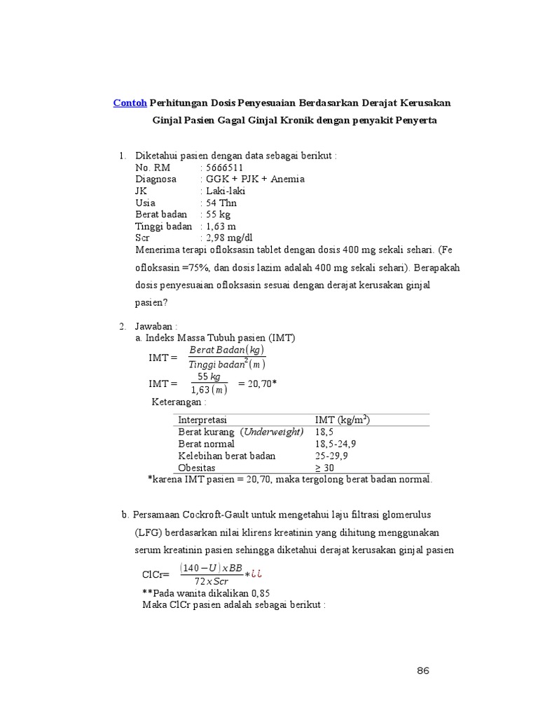 Rumus cockroft gault juga merupakan rumus alternatif yang paling sering digunakan karena hasilnya lebih cepat dengan menggunakan perhitungan kreatinin serum berat badan jenis kelamin dan usia. The cockcroft and gault formula cg was developed in 1973 using data from 249 men with creatinine it is not adjusted for body surface area. The decline in creatinine clearance is associated with advancing age.