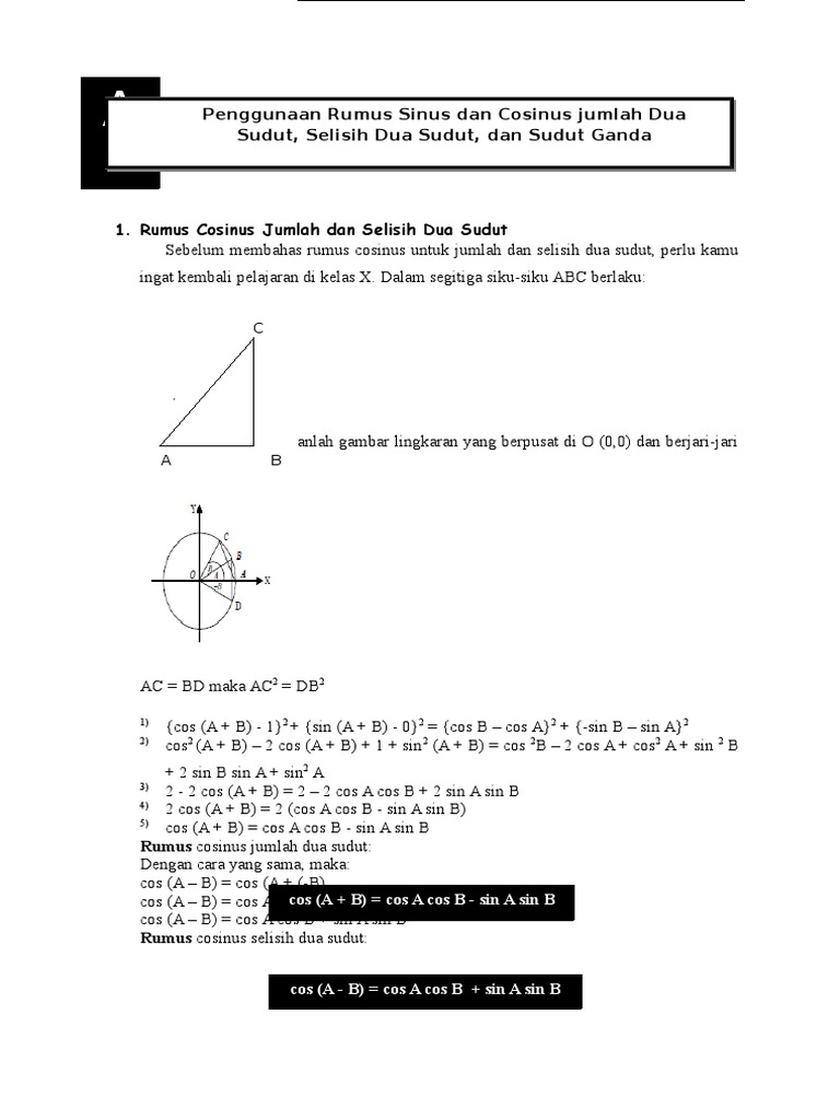 Trigonometri juga memiliki beberapa macam rumus yaitu seabagi berikut ini. Untuk memahami penggunaan rumus cosinus jumlah dan selisih dua sudut pelajarilah. Langkahnya dapat dilihat pada gambar berikut.