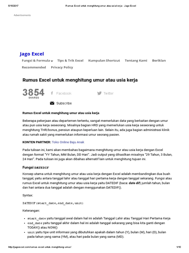 Jago Excel Rumus Excel Untuk Menghitung Umur Atau Usia Kerja Fungsi Datedif Facebook Twitter Subscribe Pdf Free Download