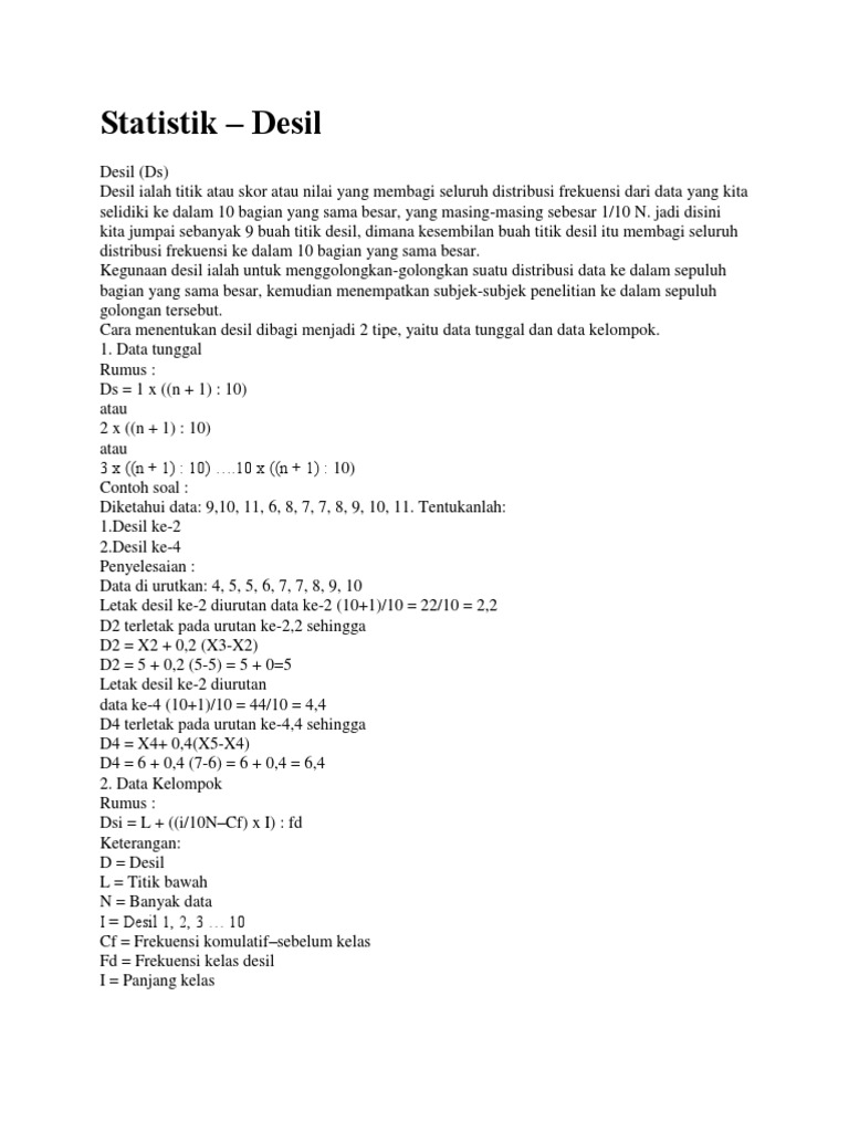 Cara mencari nilai desil pada data kelompok dapat menggunakan rumus desil untuk data kelompok yang diberikan di bawah. Rumus desil data tunggal ada beberapa rumus yang dipergunakan untuk menghitung desil namun metode yang dipergunakan ini adalah salah satu metode yang paling sederhana yaitu setiap desil dihitung dengan menambahkan satu ke jumlah data dalam populasi kemudian membagi jumlahnya dengan 10 dan akhirnya mengalikan hasilnya dengan pangkat desil yaitu 1 untuk d1 2 untuk d2 9 untuk d9. Rumus kuartil desil dan persentil dipakai untuk menentukan nilai yang menjadi batas tersebut.