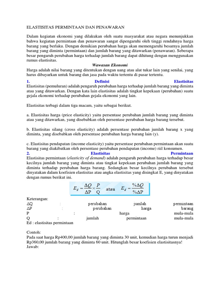 Dipembahasan sebelumnya sudah dijelaskan mengenai pengertian elastisitas dan contoh soal serta perhitungan elastisitas permintaan penawaran. 2 jika persamaan fungsi menunjukkan q a bp fungsi permintaan dan q a bp fungsi penawaran maka rumus elastisitasnya adalah sebagai berkut. Pada bagian ini akan disajikan beberapa contoh dari elastisitas permintaan dan penawaran.