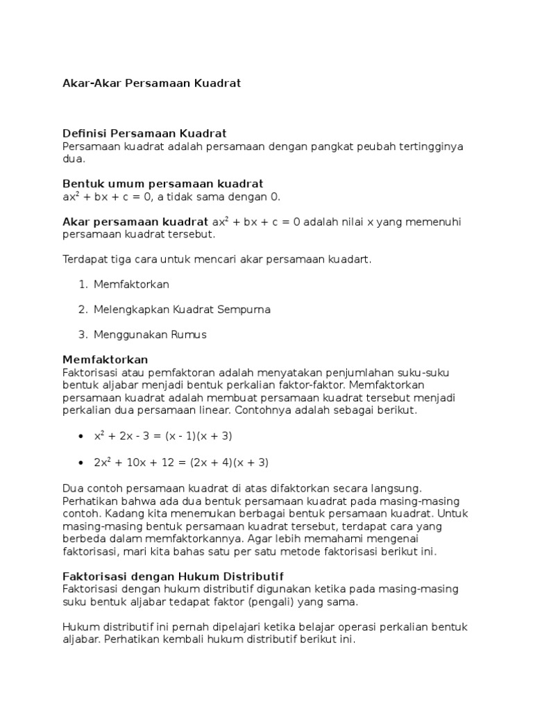 Mencari akar akar persamaan kuadrat terdapat tiga cara atau metode dalam mencari akar akar untuk menyelesaikan persamaan kuadrat. Berikut penjelasan untuk masing masing cara mencari akar akar persamaan kuadrat. Faktor dari sebuah bilangan yaitu bilangan pembagi habis suatu bilangan tersebut.