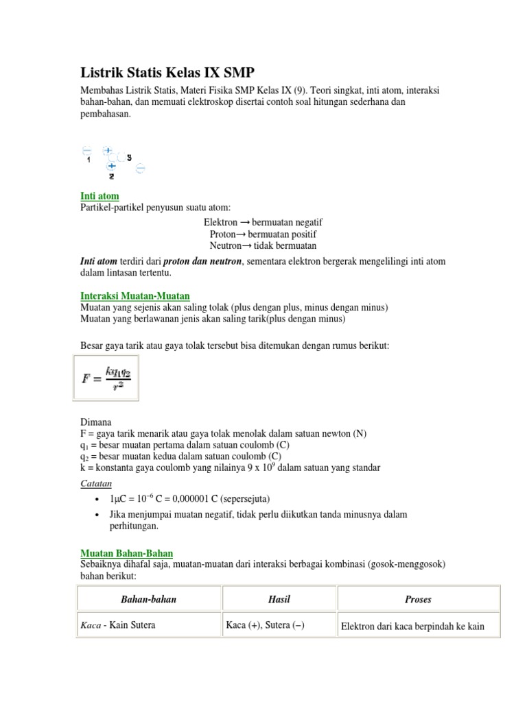 Listrik Statis Kelas Ix Smp Smp 5 Semarangsmp5 Dari Rumus Gaya Coulomb Didapatkan Soal No 2 Dua Buah Muatan Listrik Memiliki Besar Yang Sama Yaitu 6 µc Jika Gaya Coulomb Yang Pdf Document