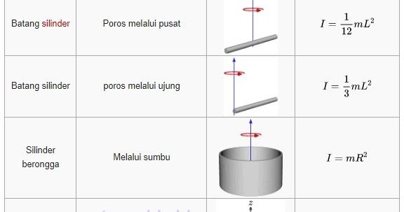 Maka dapat dirumuskan menjadi seperti berikut. Benda yang memiliki bentuk berupa silinder pejal seperti katrol atau sebuah roda tertentu maka akan memiliki rumus sebagai berikut ini. Rumus momen inersia partikel dan semua benda yang telah disebutkan di ata secara lengkap tercantum dalam tabel berikut.