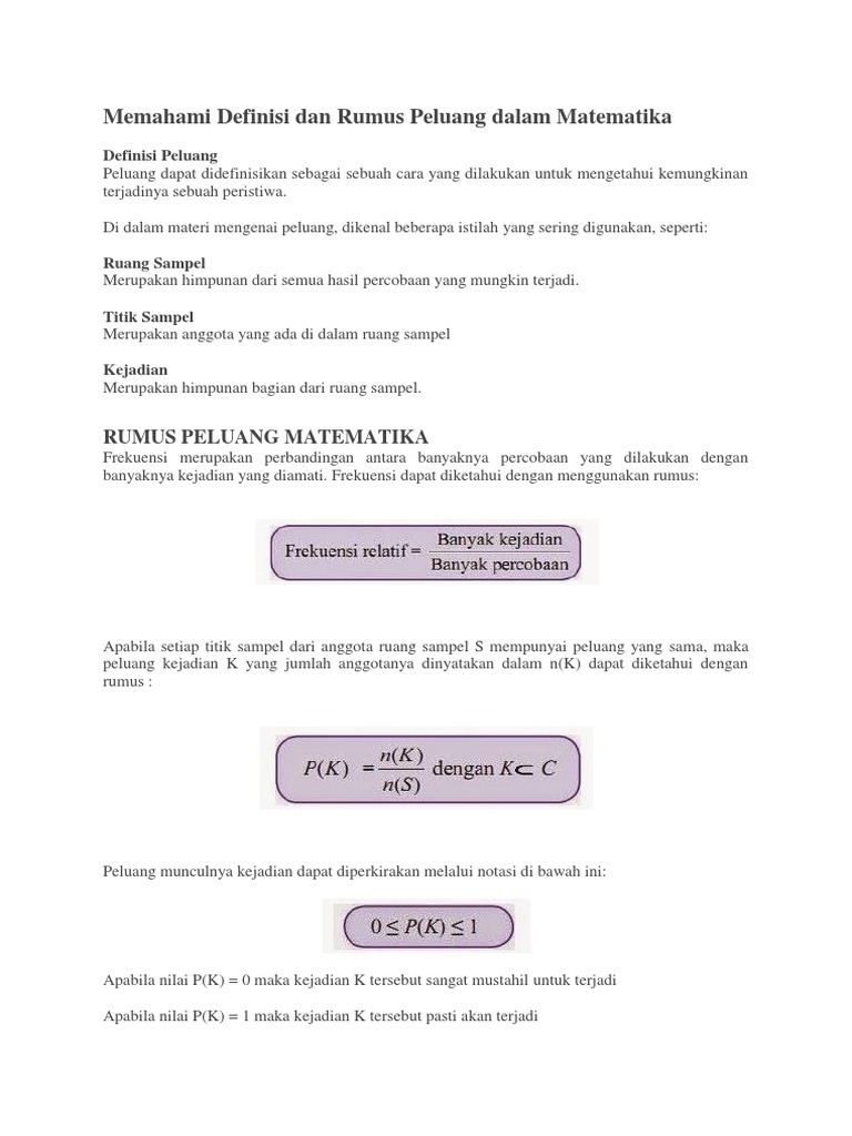 Rumus kemungkinan peluang. Rumus peluang matematika pengertian peluang didalam ilmu matematika adalah cara untuk mengungkapkan kepercayaan bahwa suatu kejadian akan terjadi atau akan berlaku dan konsep peluang ini pun telah dirumuskan secara lebih ketat di matematika karena bisa dipakai secara lebih luas bukan hanya didalam matematika saja namun telah dipakai di ilmu statistika sains filsafat keuangan dan kehidupan sehari hari. Rumus matematika selalu menyajikan berbagai rumus lengkap untuk membantu dalam penyelesaian materi dasar peluang lengkap october 20th 2017 peluangprobabilitas ketika mendengar kata peluang apa yang ada dalam pikiran teman teman. Rumus peluang probabilitaspeluang suatu kejadian a terjadi dilambangkan dengan notasi pa pa atau pra.