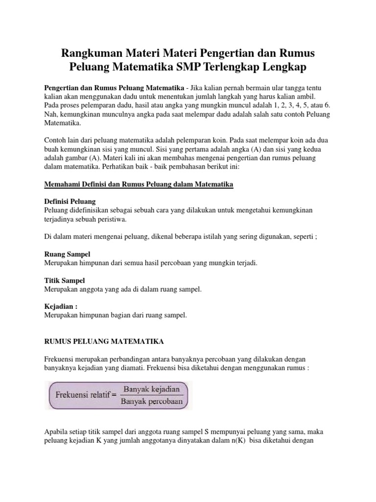 Dalam belajar rumus peluang matematika kamu perlu mengerti beberapa jenis materi yang akan kamu pelajari antara lain materi dasar materi gabungan dua kejadian materi kejadian bersyarat dan materi. Peluang pada umumnya berarti kesempatan namun pada matematika peluang atau probabilitas adalah kemungkinan yang mungkin terjadimuncul dari suatu peristiwa. Nilai peluang suatu kejadian p memenuhi sifat rumus peluang kemungkinan yang berarti jika p 0 maka kejadian tersebut tidak pernah terjadi atau suatu kemustahilan jika p 1 maka kejadian tersebut merupakan kepastian.