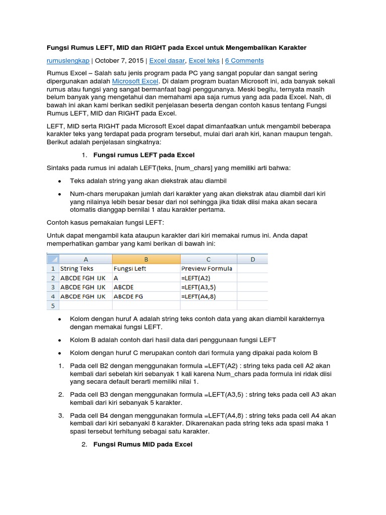 Berikut penjelasan selengkapnya tentang penggunaan fungsi rumus left mid dan right di excel. Itulah rumus excel left mid maupun right pada excel. Dengan kata lain bahwa fungsirumus left adalah fungsi yang digunakan untuk mengambil bagian kiri dari data teks sebanyak karakter tertentu dari arah kiri ke kanan.