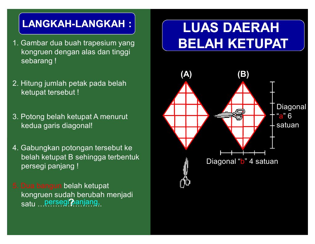 Pada kesempatan kali ini kita akan belajar mengenai belah ketupat. Berikut ini merupakan rumus untuk menentukan luas bangun datar belah ketupat. Rumus luas belah ketupat mencari luas bangun belah ketupat asrtinya adalah mencari ukuran besar daerah yang ada di dalam belah ketupat yang dibatasi oleh semua sisi pada bangun belah ketupat.