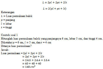 Formula ringkasnya dapat kamu lihat di atas. Untuk menambah pemahaman sobat idschool perhatikan kumpulan contoh soal balok yang diberikan di bawah. Luas permukaan balok yaitu jumlah luas keseluruhan dari permukaan bidang sisi pada balok tersebut.