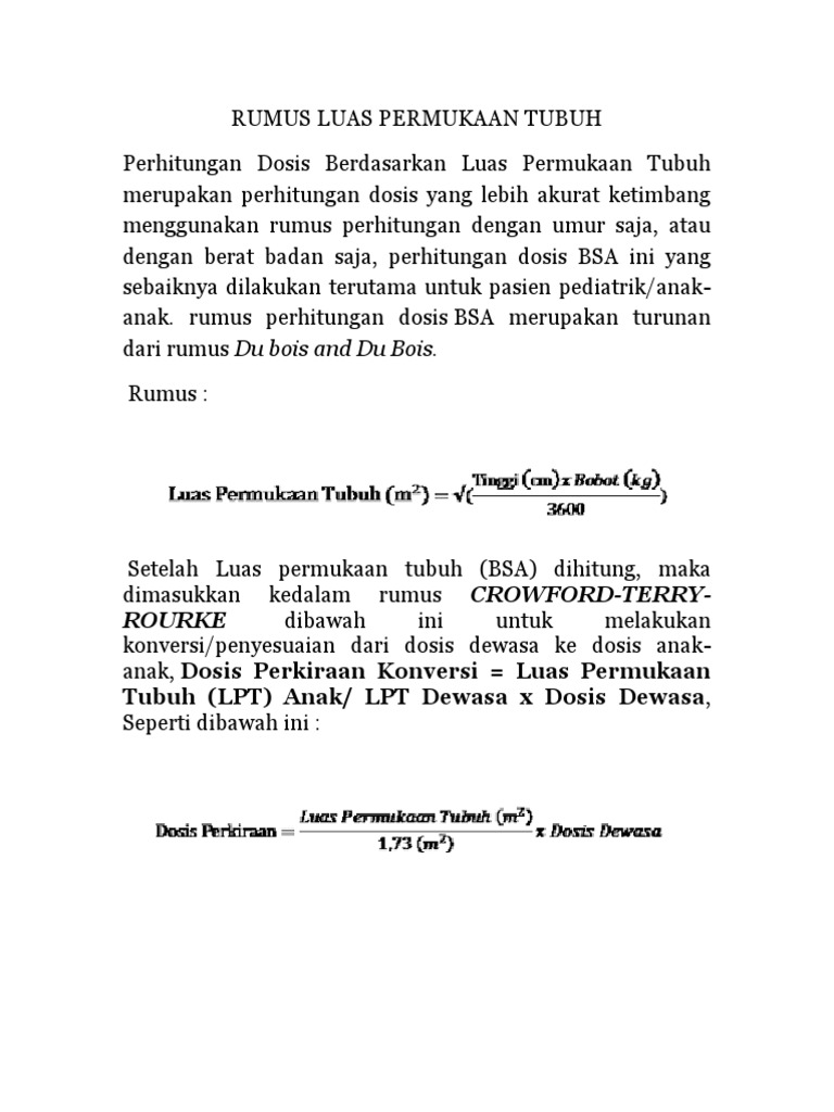 Penentuan Dosis Berdasarkan Luas Permukaan Tubuh Lpt Kecepatan Metabolisme Obat Sangat Memungkinkan Untuk Menghitung Dosis Secara Lebih Tepat Seorang Anak Berumur 11th Pdf Document