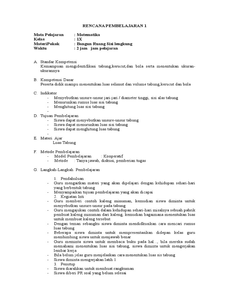 Rencana Pembelajaran 1 Mata Pelajaran Matematika Kelas 1x Materipokok Bangun Ruang Sisi Lengkung Waktu 2 Jam Jam Pelajaran