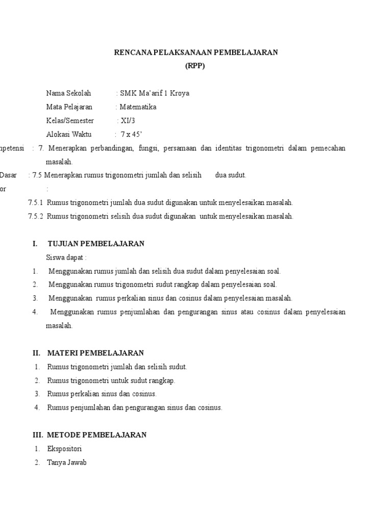 Rpp Maryanto Trigono Rumus Jumlah Dan Kali Sm An9teboschid Mary