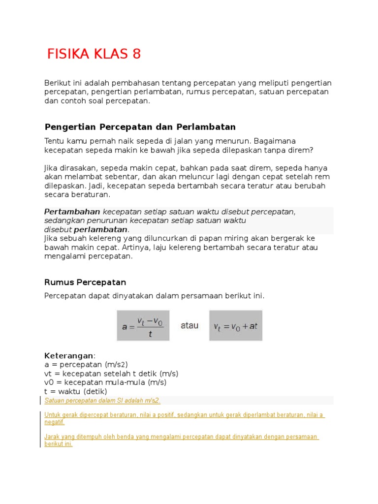 Rumus Percepatan Suatu Benda Yang Bergerak Dinyatakan Dengan A T T 1 Kecepatan Saat T 0 Adalah 6 Brainly Co Id