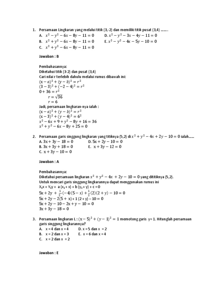 Persamaan Lingkaran Yang Berpusat Di 1 3 Menyinggung Garis 3x 4y 11 0 Adalah Brainly Co Id