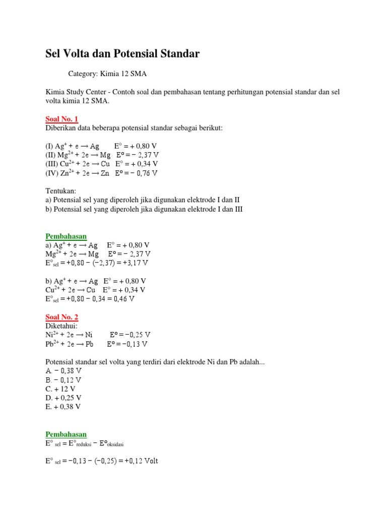 Contoh Soal Sel Volta Bag 1 Pdf Contoh Soal Pembahasan Sel Volta Bag I Soal No 1 Tan Diketahui Potensial Elektrode Perak Dan Tembaga Sebagai Berikut Course Hero