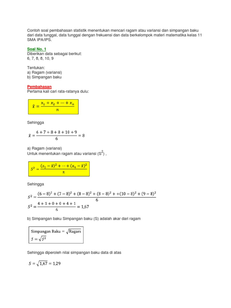 Rumus Simpangan Baku Simpangan Rata Rata Ragam Variansi Koefisen Keragaman Contoh Soal Data Tunggal Kelompok Jawaban Statistik Matematika