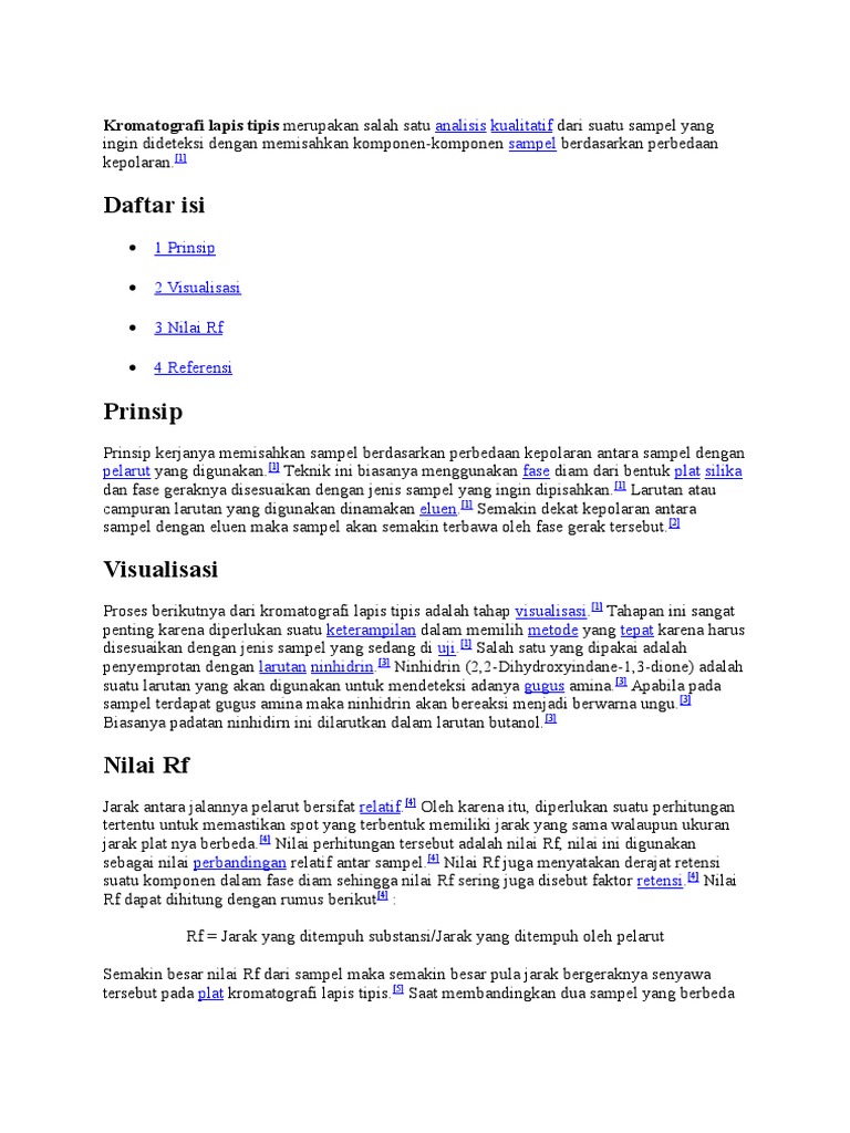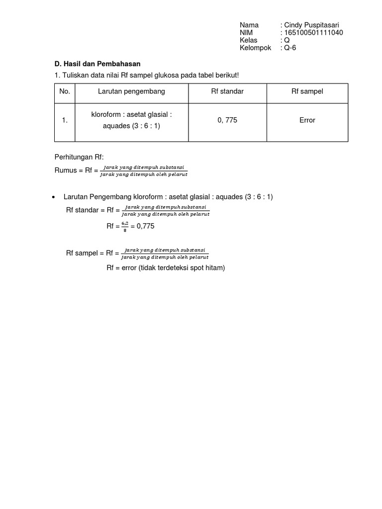 Jika rf terlalu tinggi yang harus dilakukan adalah mengurangi kepolaran eluen dan sebaliknya gandjar2007. Nilai rf dapat dihitung dengan rumus berikut. Rf jarak yang ditempuh substansi jarak yang ditempuh oleh pelarut semakin besar nilai rf sampel semakin besar jarak gerakan senyawa pada pelat kromatografi lapis tipis.