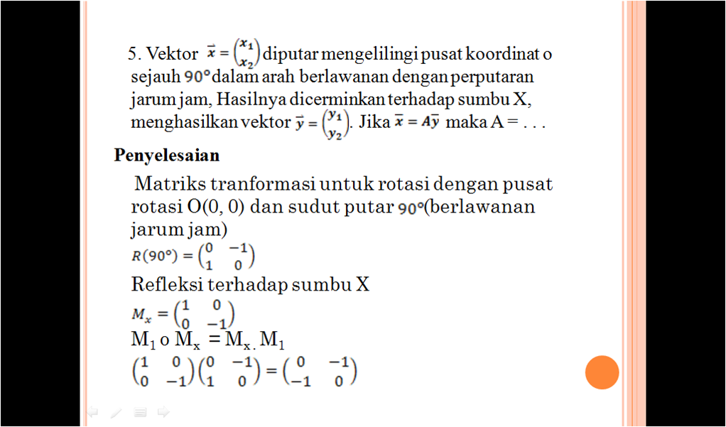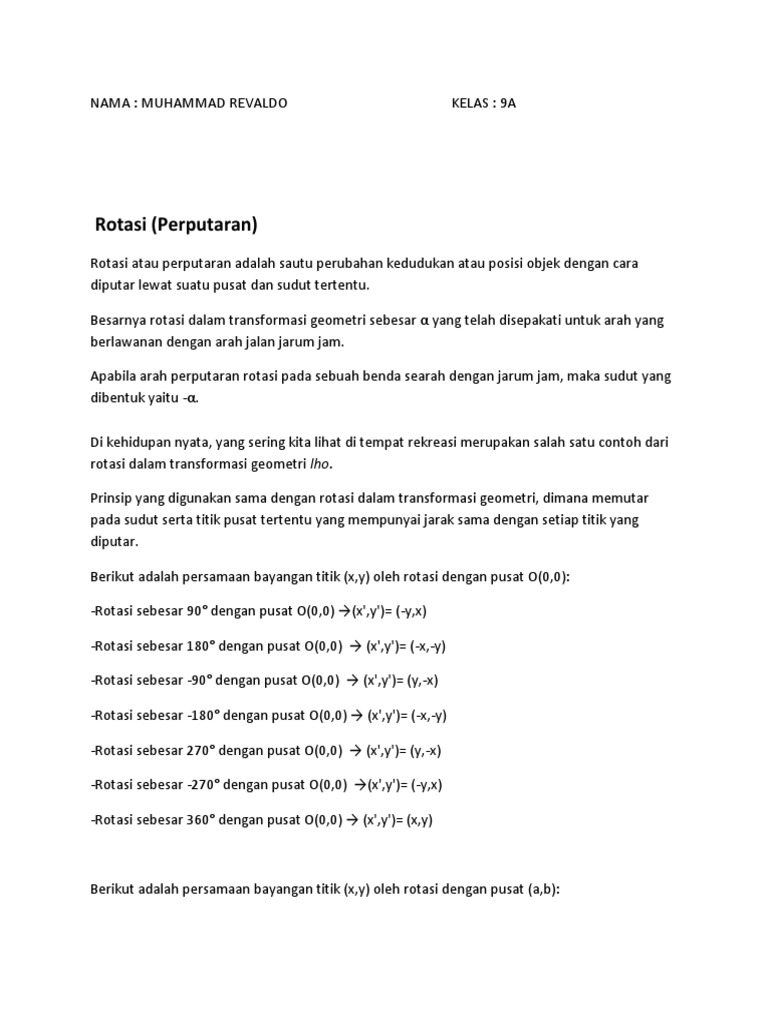 Untuk menentukan bayangan titik yang di rotasi dengan pusat 00 sejauh 90 o dapat dengan menggunakan matriks transformasi dimana o 90 o. Rotasi atau perputaran merupakan perubahan kedudukan objek dengan cara diputar melalui pusat dan sudut tertentu. Matriks disebut matriks rotasi dengan pusat di o00 dan sudut putar sebesar o radian.