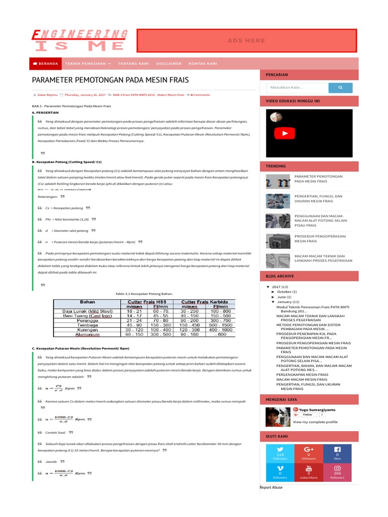 Hantaran ini dapat dikonversikan kedalam kecepatan hantaran fr dalam mmmin dengan memperhitungkan kecepatan spindle v dan jumlah gigi pemotong nt. Parameter dan perhitungan kecepatan pisau frais metrik parameter and calculation speed metric of milling cutter. Putaran mesin yang terlampau tinggi melebihi perhitungan sebenarnya akan mengakibatkan alat potong akan menjadi panas sehingga terjadi perubahan struktur pada logam alat potong sehingga alat potong cenderung menjadi panas dan alat potong akan cepat menjadi tumpul.