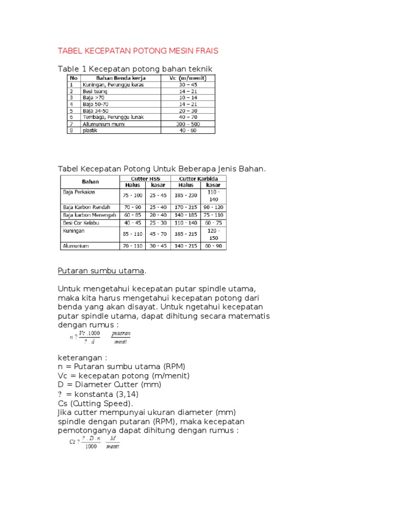 Rumus rpm frais. Mengingat nilai kecepatan potong untuk setiap jenis bahan sudah ditetapkan secara baku maka komponen yang bisa. Dengan demikian rumus untuk menghitung putaran menjadi. Pengaturan putaran pada suatu mesin bubut frais dan bor sangatlah dibutuhkan.