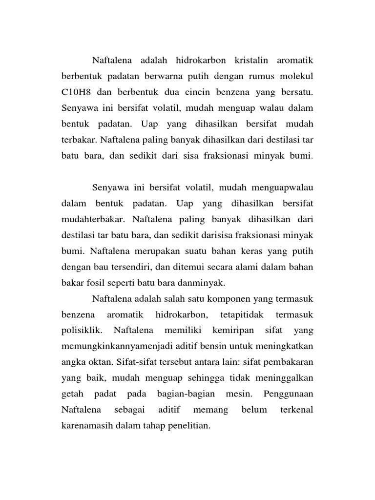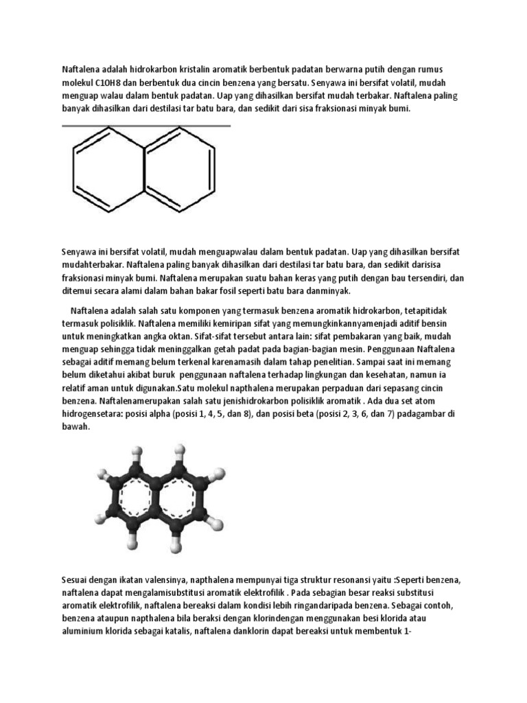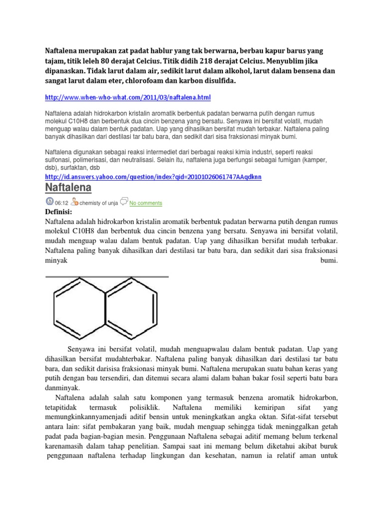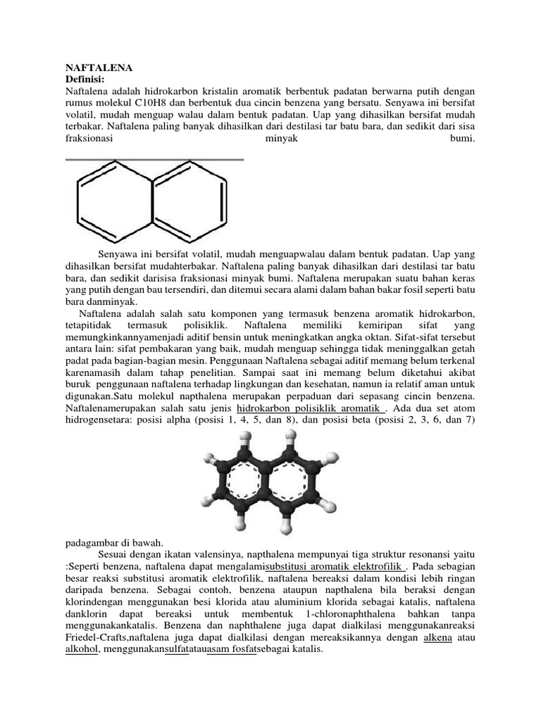 Dan juga menjelaskan tentang cara menaikan nilai oktan pada bensin. Dan juga di lengkapi dengan gambar untuk memudahkan pemahaman. Naftalena adalah hidrokarbon kristalin aromatik berbentuk padatan berwarna putih dengan rumus molekul c10h8 dan berbentuk dua cincin benzena yang bersatu.