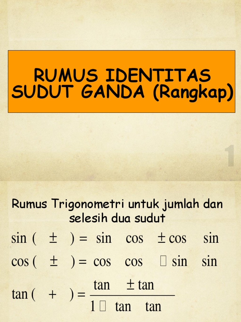 Trigonometri A Trigonometri Rumus Jumlah Dan Selisih Sudut Identitas Sudut Ganda Setengah Sudut Konversi Kali Ke Jumlah Kurang Jumlah Kurang Ke Kali Pdf Document