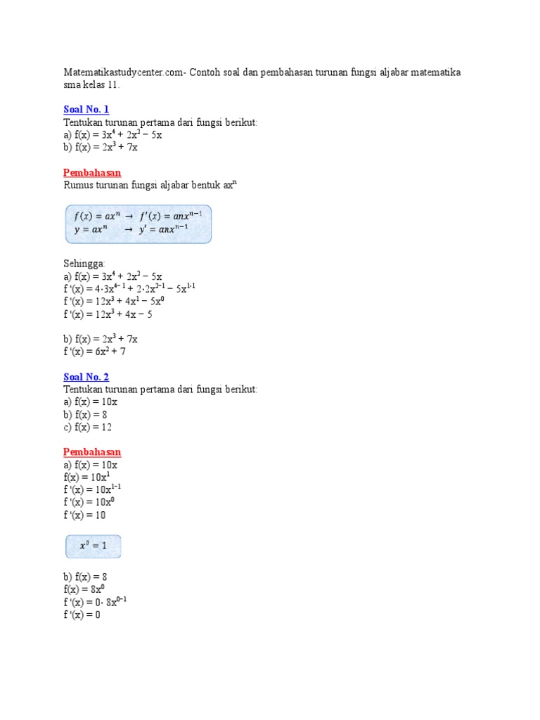 Contoh Soal Matematika Turunan Fungsi Aljabar Kelas Xi Sma Smk Kurikulum 2013 Dan Pembahasannya Kumpulan Soal Ujian