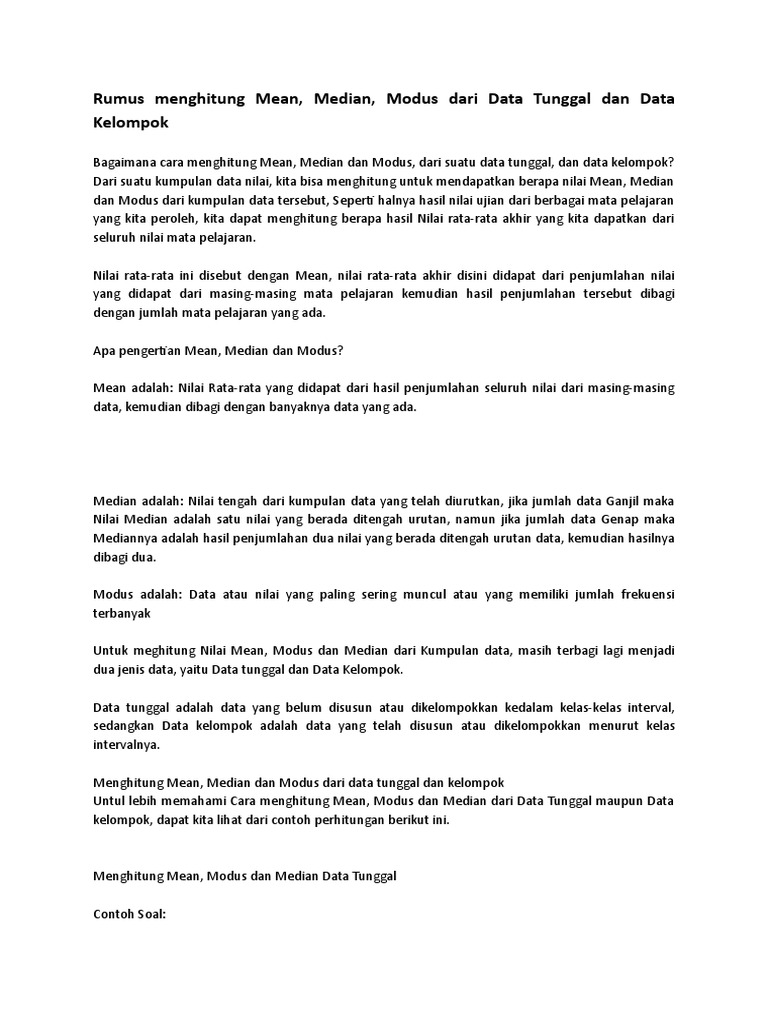 Sebagian dari kita ada yang bertanya tentang bagaimana cara menghitung mean median dan modus dari suatu data tunggal. Hai sobat statmatid pada kali ini kita akan mempelajari tentang salah satu cabang ilmu matematika yang sering digunakan untuk menganalisis atau mengolah data hasil penelitian yakni statistika. Mean untuk data kelompok.