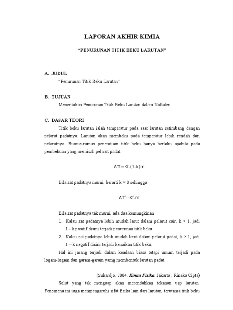 Titik Beku Lap Titik Beku Penurunan Titik Beku I Tujuan Dapat Menentukan Harga Kb Suatu Pelarut Dapat Menghitung Berat Molekul Suatu Zat Yang Tidak Course Hero