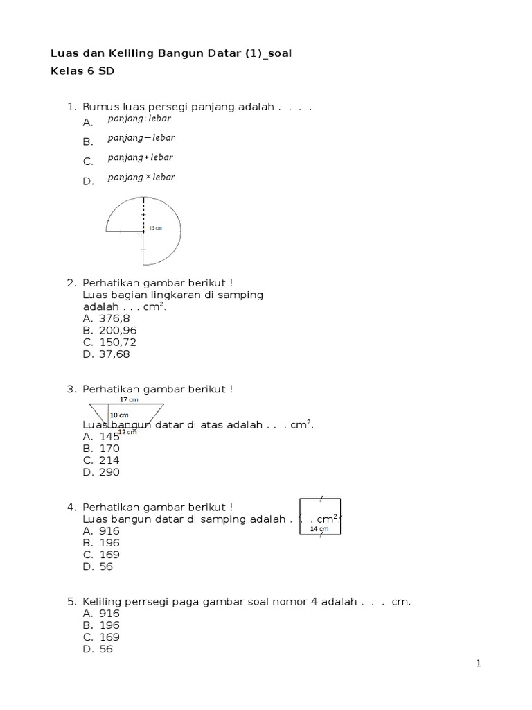 Luas Dan Keliling Bangun Datar 1 Soal Kelas 6 Sd 1 Rumus Luas Persegi Panjang Adalah A B C D Pdf Free Download